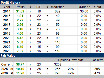 Note, my Fair Value is a P/E of 45. When we combine that with 2025 profit estimates this gives me a Fair Value of $199 with upside of 33%.