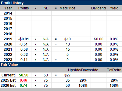 This is too young of a company to price the stock on a P/E basis, so I will use price-to-sales. This quarter, the stock sells for 7x 2024 revenue estimates. My Fair Value is also 7x revenue. When I do the math I feel the stock can make its way towards $70 in 2025.