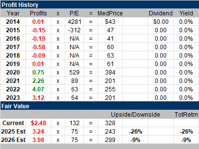 Notice in the Profit History table the Current line is info as of when the table was made (analyst’s 2024 profit estimates, current P/E, and stock price at the time).