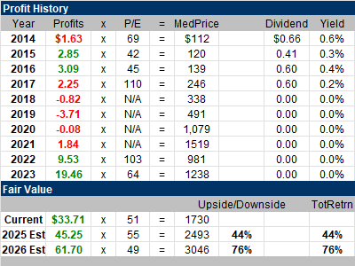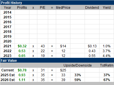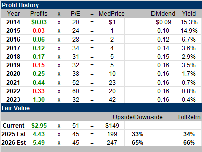 The 2025 Est. line uses 2025’s profit estimates along with the P/E I think the stock should have, and this is how the price target is derived.