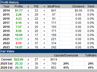 My Fair Value P/E is 30. This stock has 24% upside to my $760 Fair Value for 2025.