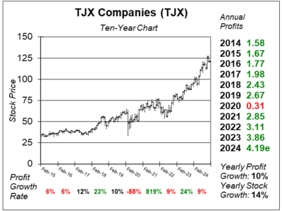 Here is the ten-year chart of TJX Companies (TJX) as of January 6, 2025, when the stock was at $121.