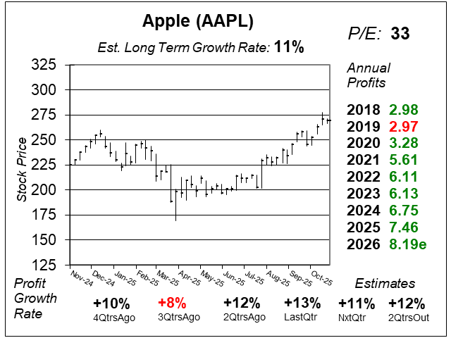 Apple (AAPL) has been trending higher as qtrly profit growht has accelerated. But with a P/E of 33, the good news seems priced in.
