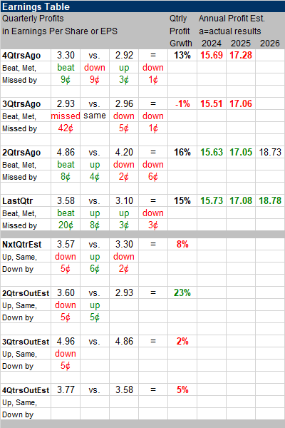 E-commerce sales increased 6% with strength in various product categories such as food, e-gift cards, pet items, and snacks. Appliances showed a mid-20s growth compared to the previous year. Despite challenges in consumer electronics like computers, TV sales were up at a high single digit rate. Executive memberships represented a little over 46% of total memberships and these customers accounted for 73% of company sales. Annual Profit Estimates are up this qtr. Qtrly Profit Estimates are for 8%, 23%, 2%, and 5%, growth the next 4 qtrs. Quarterly profit growth estimates are all over the place. Note the 2QtrsOutEst. is big due to easy year-over-year comparisons (-1% in the year ago period). Analysts believe COST revenue will grow by 6% next quarter. |
