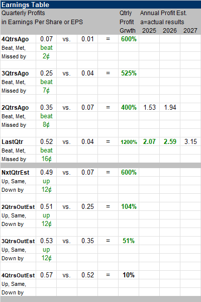 The Est. LTG is 187% this qtr, up from 172% last qtr. That’s insanely high! Note, that’s an analyst estimate of what profits could grow over the next 3-5 years, not estimated stock growth. The P/E of 70 is what I imagine a rapid grower like this should be selling for. Qtrly profit growth has been excellent and Estimates are looking good! Notice the company is projected to maintain triple-digit profit growth. Top stocks often have triple-digit growth. |