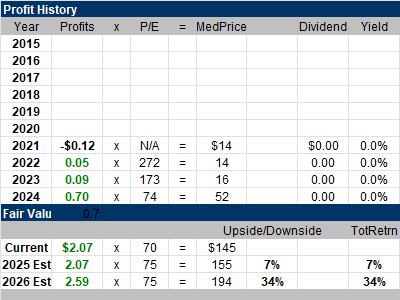 My Fair Value P/E is 75, up from 65, which is $155 a share, giving the stock upside of 7%. Upside for 2026 is a solid 34%. So I feel CRDO stock might take a breather. The key when analyzing this stock is what might the company make in profits? 2025 estimates just jumped from around $1.50 to ~$2.00. |