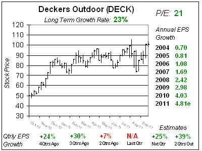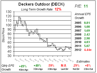 DECK’s profits rose 30% last quarter on a 24% increase in sales. UGG contribute around 95% of sales.The company can be counted on to whip earnings estimates, so don’t get discouraged by poor quarterly estimates ahead. Annual Profit Estimates surged. So much that I did a double-take and had to confirm these figures. 2012 estimates increased a whopping 22% from the estimate just three months ago.As mentioned above, quarterly estimates will stink the next couple of quarters. Let me change that, might stink, as DECK should beat the street. Don’t let quarterly estimates discourage you about Decker’s prospects. |