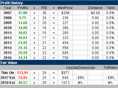 For years I have felt this stock deserved a P/E around 30. 20% growers that do it every year deserve a premium price. But the stock market didn’t agree with me, and saddled the stock with a 21-22 P/E. So I pegged my Fair Value at a P/E of 25 as it is very difficult to get a P/E to rise to another level. Now that the P/E is 29, I don’t think that can hold.