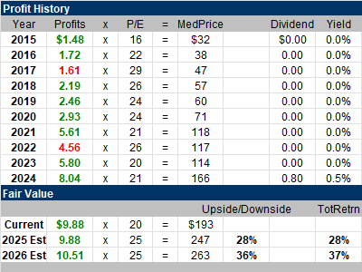 My Fair Value is a 25 P/E, that’s $247 a share. I believe this stock has 28% upside for 2025 and 36% upside for 2026. In 2017, GOOGL changed its accounting practices to more conservative accounting, and that’s why profits declined that year. |