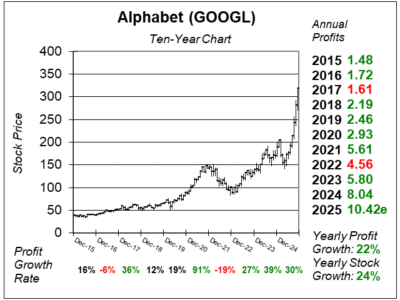Alphabet is a conservative growth stock with a good growth rate. Prior to 2022, the company had profits up every year since its IPO outside of 2017 (which was only down as it switched its accounting practices to a more conservative stance). The stock has an Est. LTG of 17% a year, and a P/E of 29. Management pays a tiny dividend and also buys back stock. In 2024, management has returned almost $70 billion to shareholders via stock buybacks and dividends. GOOGL is part of my Growth Portfolio, Conservative Growth Portfolio, and Aggressive Growth Portfolio.