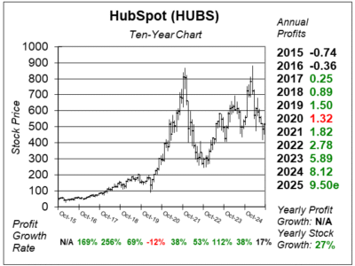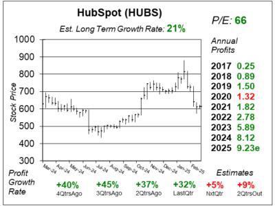 HubSpot software is similar to Salesforce’s, but this service is less expensive. I like the Salesforce comparison as that was one of the best stocks of the 2010’s decade. HubSpot is growing sales and profits faster than Salesforce. Analysts give HUBS an Estimated Long-Term Growth Rate of 20% per year. HUBS doesn’t pay a dividend, but does have a stock buyback program. HUBS is part of our Growth Portfolio. |