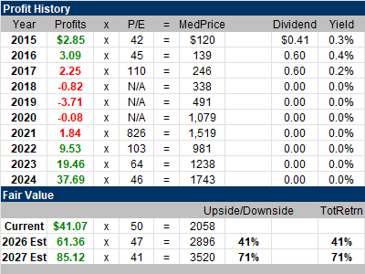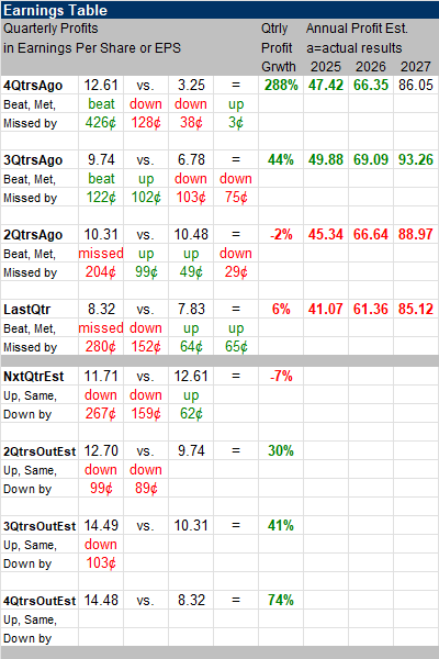 The Est. LTG is 32%, same with 2QtrsAgo. That would be a nice profit growth rate. The P/E is 34, down from 53 2QtrsAgo. But this qtr I calculated the P/E in this chart off of next year’s (2026) profit estimates because we are in the company’s Fiscal Q4. Notice in Annual Profits that profits are expected to climb from $41 to $61 in 2026. That’s HUGE. Quarterly profit growth is often erratic with this company. We have to accept this. It’s been that way for years. |