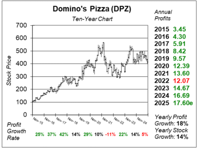 Here is the ten-year chart of Domino’s (DPZ) as of October 27, when the stock was at $413.