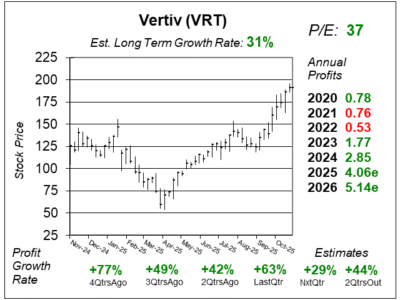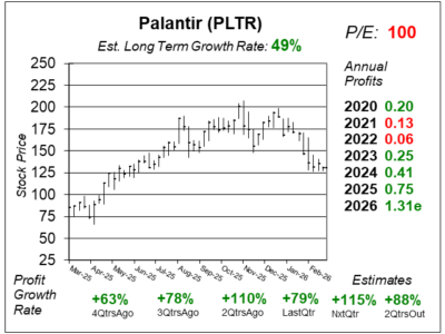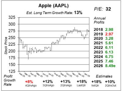 Charts are one-year charts showing qtrly profit growth along the bottom. Note the charts and tables are from the latest quarter (2024 Q4). The stocks have moved in price since these images were made.