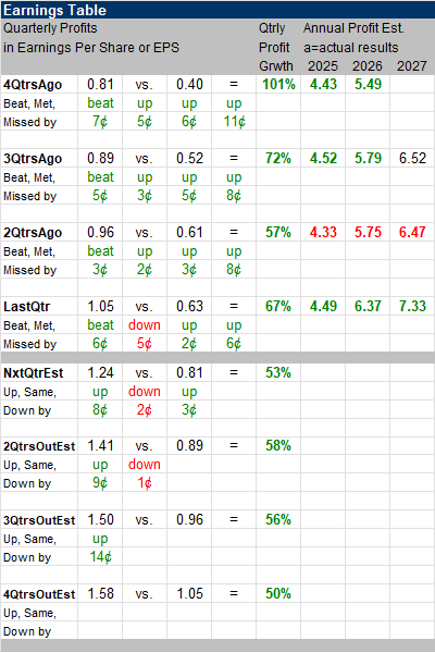Annual Profit Estimates increased this qtr, but 2025 estimates have been rather stable the past year. From $4.43 4QtrsAgo to $4.49 this qtr. That’s not impressive. Note, estimates fell last qtr due to US restrictions on sending chips to China. Qtrly Profit Estimates for the next 4 qtrs are 53%, 58%, 56%, and 50%. That’s impressive. For next qtr, analysts predict revenue will climb 56% year-over-year. |