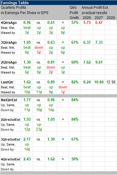 Annual Profit Estimates increased by a good amount this qtr. Qtrly Profit Estimates for the next 4 qtrs are 84%, 84%, 67%, and 50%. That’s impressive. For next qtr, analysts predict revenue will climb 78% year-over-year. |