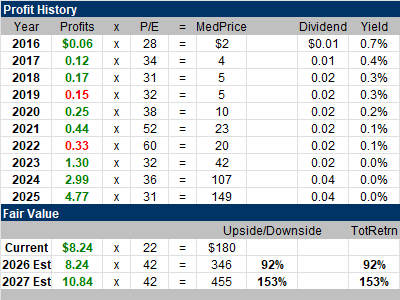 My Fair Value is a P/E of 42, and when we plug in 2026 profit estimates, we get a Fair Value of $346 a share, 92% higher than the recent quote of $180. There’s ample upside for 2027 — 153% — as my guess is the stock could be $455 by then. |