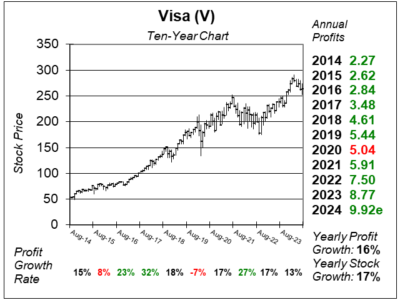Here is the ten-year chart of Visa (V) as of July 30, 2024, when the stock was at $264.