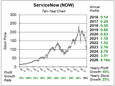 Here is the ten-year chart of ServiceNow (NOW) as of February 10, 2026, when the stock was at $106.