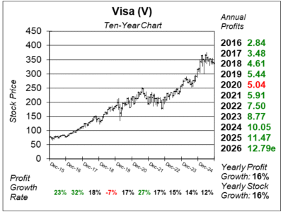 Here is the ten-year chart of Visa (V) as of November 10, 2025, when the stock was at $337.