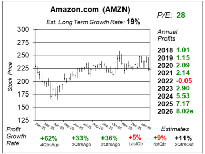 Here is the one-year chart of Amazon (AMZN) as of February 5, 2026, when the stock was at $223.