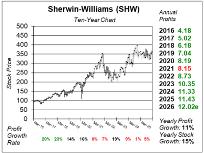 Here is the ten-year chart of Sherwin-Williams (SHW) as of February 5, 2026, when the stock was at $361.
