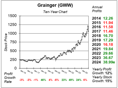 Here is the ten-year chart of Grainger (GWW) as of December 30, 2024, when the stock was at $1,058.